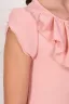 Блузка для девочек младшего и старшего школьного возраста, из однотонного трикотажного полотна кулирка с лайкрой и шифона. Блузка полуприлегающего силуэта, с втачным рукавом из шифона, без застежки. Спереди и на спинке отсутствуют линии членения. Рукав короткий, из двух частей, присборенный по окату. Низ рукавов обметан на краеобметочной машине. Низ изделия подогнут. Срез горловины обработан узкой окантовочной лентой из того же полотна. Спереди жабо из шифона с декоративным элементом.
