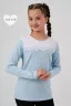 Джемпер для девочек младшего и старшего школьного возраста, из трикотажного полотна кулирка с лайкрой. Джемпер прилегающего силуэта, с втачным рукавом. Спереди кокетка. На шов притачивания кокетки к нижней части переда настрочено кружево и приклеены полубусины. На спинке отсутствуют линии членения. Рукав длинный с одним швом. Низ рукава и изделия подогнуты.