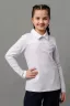 Блузка для девочек младшего и старшего школьного возраста, из однотонного трикотажного полотна кулирка с лайкрой. Блузка полуприлегающего силуэта, с втачным рукавом, с застежкой на одну пуговицу и петлю, с сорочечным воротником со стойкой. На деталь переда из кулирки с лайкрой настрочена кружевная кокетка. На детали спинки разрез под застежку. Рукав длинный одношовный. Воротник сорочечный с отрезной стойкой. По отлету и концам воротника, по шву притачивания стойки в горловину и шву стачивания стойки с воротником проложена отделочная строчка. На кокетку переда по центру приклеены 4 бусины. Низа рукавов и изделия подогнуты.
