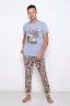 Пижама мужская: брюки с боковыми карманами, заужены к низу, манжет из рибаны; футболка с коротким рукавом и со стильной печатью на груди.