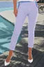 Брюки прилегающие в мелкую полоску, длина 7/8, на манжете. Пояс, отделка по бокам, сзади накладные карманы и кокетка из отделочной ткани, имитирующей джинс.