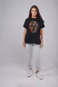 Футболка женская, повседневная, нарядная, спортивная, большие размеры, свободный крой, удлиненная, круглая горловина, стильная, черного цвета из трикотажного хлопок с эластаном, 170 г/м2 с прикольным принтом. Принт трансфер принт - технологией нанесения картинки на изделие с использованием высоких температур. Стилизованный принт черепа - стильное сочетание модного и дерзкого дизайна добавляет выразительности и разнообразию ежедневному стилю одежды. Модель - размер одежды M(46) 170-92-98, футболка на модели в размере L