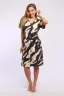 Этот халат выполнен в современном камуфляжном стиле с преобладанием черных и бежевых цветов. Он имеет короткие рукава и длину до колена, что делает его удобным и практичным для повседневного ношения. Спереди халат застегивается на молнию, что обеспечивает легкость надевания и снятия. На боковых сторонах имеются два глубоких кармана с оригинальными овальными прорезями, которые добавляют модели функциональности и стильности. Халат также дополнен поясом, который подчеркивает талию и позволяет регулировать посадку по фигуре. Материал, из которого изготовлен халат, мягкий и приятный к телу, что обеспечивает комфорт при носке.