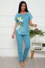 Пижама женская из натурального трикотажа - хлопок 100%. Линия плеч спущена, горловина круглой формы, по плечам кокетки оформленые кружевом контрастного цвета. Низ изделия прямой, на полочке располагается большой принт (шелкография). Брюки прямые, по низу на манжете, пояс цельнокроеный, без карманов.