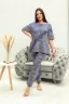 Костюм состоит из туники и брюк. Туника прямого силуэта, с округлой горловиной, длиной до середины бедра. Спинка с кокеткой, удлиненная. В нижней части боковых швов обработаны разрезы. Рукав короткий. Горловина обработана бейкой из основного полотна. Брюки на поясе, с боковыми карманами, с лампасами.