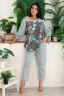 Костюм женский - туника и брюки. Брюки полуприлегающие, длина 7/8, с цельнокроеной манжетой. Пояс прострочен на многоигольной машине, на передней части брюк два внутренних кармана. Туника с открытыми плечами на широких бретелях, расширенная к низу, в боковых швах разрезы, рукав ниже локтя, по низу рукава сборка, манжета с завязками. На модели 48 размер