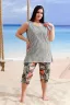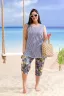 Костюм женский: майка и бриджи. Майка слегка расширенная к низу, в боковом шве разрезы. На полочке и спинке кокетки. Бриджи свободные по бедрам, низ брюк собран на эластичную тесьму. Пояс выполнен на многоигольной машине, на передних половинках внутренние карманы.
