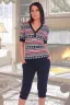 Костюм из интерлока футболка + бриджи. У футболки V-образный вырез на двух пуговицах, короткие рукава на манжетах, геометрические узоры. Однотонные темные бриджи с карманами, длина чуть ниже коленей