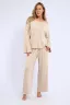 Костюм состоит из кофты и брюк. Кофта свободного кроя с длинными расклешенными рукавами. Брюки свободные прямые с карманами.