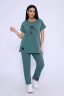 Легкий женский костюм прямого силуэта. Верх двойки - футболка с коротким рукавом и округлой горловиной. Футболка свободная с принтом. Низ - прямые брюки без карманов, пояс на резинке. Данная модель подойдет как и для повседневной носки, так и для дома. Удобный и приятный костюм. Рост модели на фото 165, размер 48.