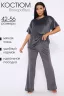 Костюм женский велюровый, повседневный, всесезонный. Костюм состоит из футболки и брюк. Футболка оверсайз прямого силуэта, длиной до бедра. Рукав втачной со спущенным плечом, длиной чуть выше локтя. Горловина с обтачкой, низ футболки с подгибкой. Брюки прямого силуэта, умеренного объема. На передних половинках брюк карманы с отрезным бочком. Пояс притачной с эластичной тесьмой. Низ брюк подгибка. Замеры объема талии брюк по нерастянутой резинке. Параметры модели 97-71-101. На модели представлен 48 размер.