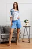 Костюм состоит из укороченной футболки "оверсайз" и шорт. Футболка с округлой горловиной. Рукав короткий. Горловина обработана бейкой из основного полотна. Шорты на поясе, с боковыми карманами и лампасами. В верхней части передних половинок по шву притачивания пояса расположены складки. В нижней части боковых швов обработаны разрезы.