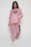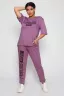 Костюм из вискозы, состоит из футболки и брюк. Футболка свободная, рукав до локтя, горловина обработана под окантовку по переду принт. Брюки по переду со складками, с карманами с принтом на одной брючине, длина до щиколотки. На модели 48-50 размер.