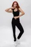 Комплект состоит из топа и брюк. Топ на узких бретелях, с округлой горловиной на полочке и вырезом "борцовка" сзади. В верхней части спинки расположена фигурная кокетка и декоративным вырезом. Горловина, проймы и вырез на спинке обработаны бейкой из основного полотна. Брюки на поясе, с боковыми карманами, с лампасами из отделочного полотна вдоль боковых швов, с манжетом.