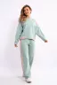 Костюм женский из мягкого, тонкого комбинированного футера . Свитшот с рельефами, в свободном стиле Oversize. Круглая горловина обработана обтачкой, спущенная пройма, длинный рукав, с надписью на передней полочке. На спинке кокетка, низ на широком манжете с декоративным шнуром. Брюки- трубы с лампасами и удобными карманами в боковых швах. Стильный, комфортный костюм идеальный вариант для повседневного гардероба.