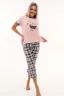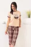 Уютная пижама с оригинальным принтом из очень мягкой, приятной к телу ткани. Футболка с спущенной линией плеча. Бриджи свободного кроя. В измерениях в обхвате талии указана длина резинки. Может использоваться как домашний костюм.