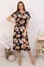 Летнее лёгкое платье из тонкой ткани с цветочным принтом. Модель длиной чуть ниже колена, отрезная по линии талии, с напускным верхом и коротким цельнокроеным рукавом. В поясе мягкая резинка. На округлой горловине небольшой вертикальный разрез на завязках. Удобное платье на каждый день.