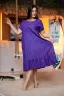 Платье женское, свободное, расширенное к низу, на подкладке. Рукав реглан, короткий. Горловина округлая, внизу платья широкая рюша, в боковых швах внутренние карманы.