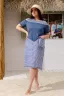 Платье прямого силуэта, слегка расширенное к низу. В модели хорошо сочетаются ткани в полоску и меланжевая. Верхняя часть рукава отсутствует, верхний срез собран благодаря эластичной тесьме. На полочке и спинке кокетки, полочка состоит из трех частей, верхняя часть отлетная. Отдельно изготовленный карман настрочен на полочку.