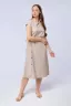 Женское платье с акцентом на талии разработано специально для жарких летних дней. Благодаря свободной посадке платья в нём будет комфортно на улице, а длинна и фасон позволяют ему любимчиком в офисном гардеробе. Пояс с завязкой сбоку, выгодно подчеркнёт талию, а вертикальный ряд пуговиц на юбке вытянет силуэт и сделает его стройнее. Лён, из которого выполнено платье, является экологичным и дышащим материалом. Пуговицы из дерева отлично дополняют дизайн платья.